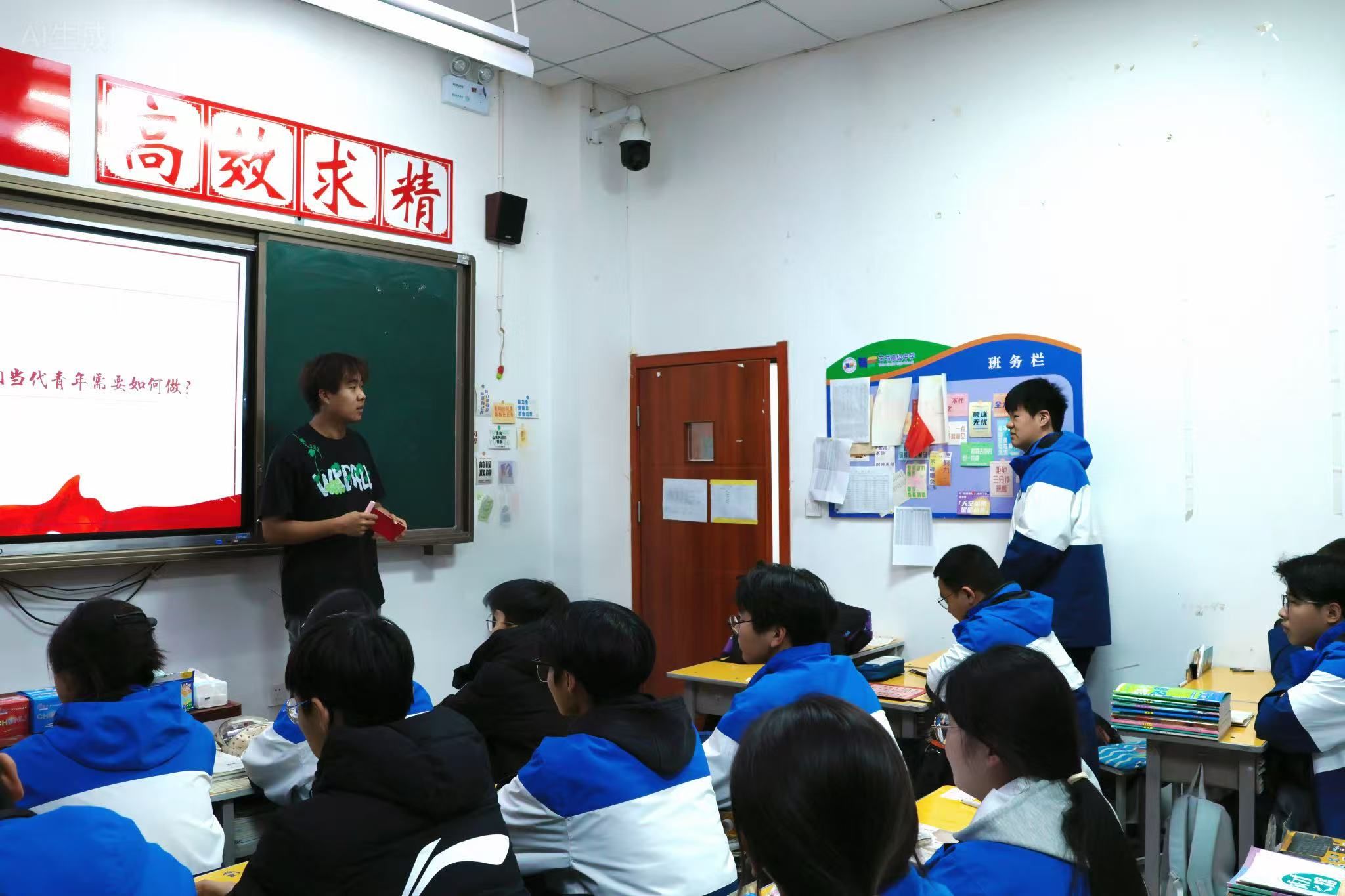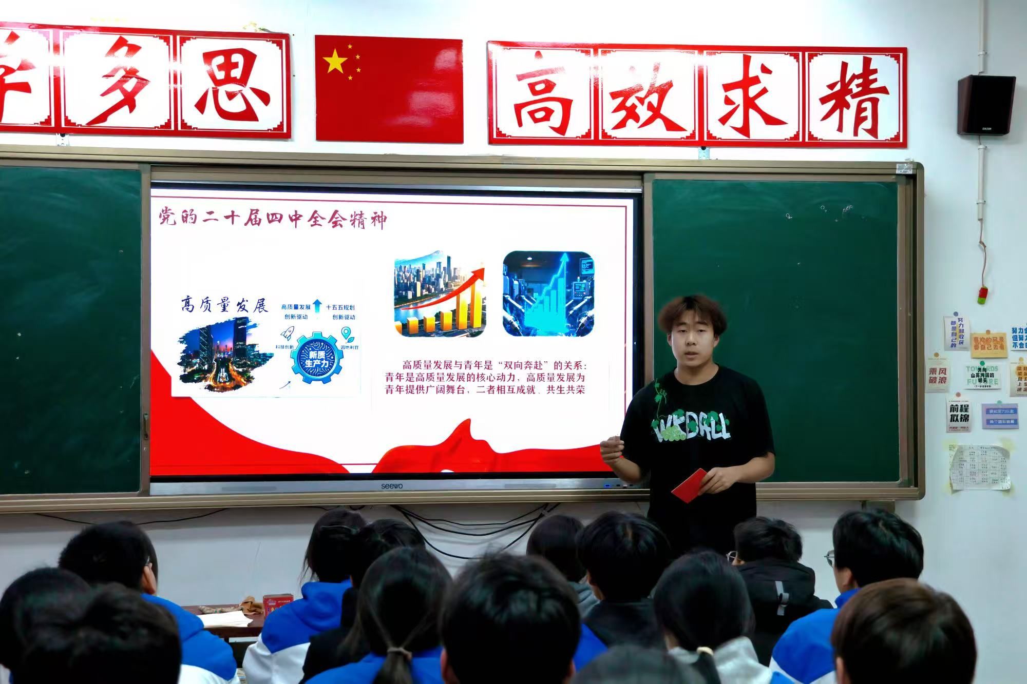 为深入学习贯彻党的二十届四中全会精神,12月4日,校大学生理论宣讲团骨于及青马班成员,前往郑州艺书高级中学进行党的二十届四中全会精神专题宣讲会。本次宣讲以“中国共产党人精神谱系里的青春接力”为主题,由宣讲人张闰喆主讲,郑州艺书高级中学高二年级学生参与宣讲会。