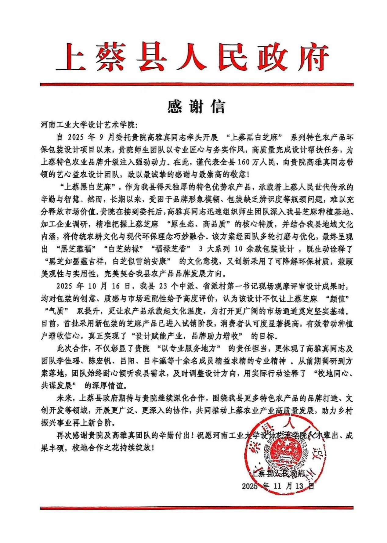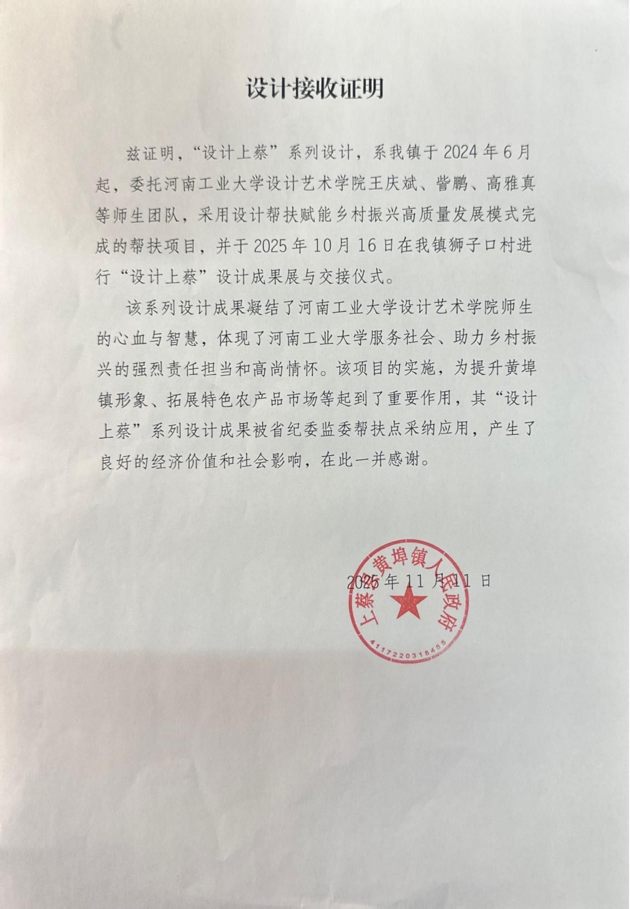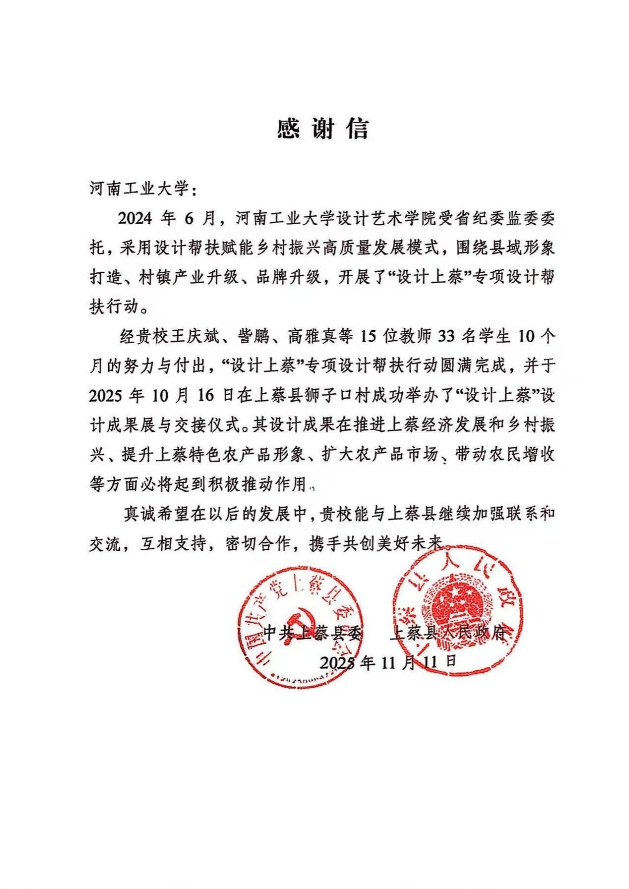 近日,河南省上蔡县委、县政府及黄埠镇人民政府先后向河南工业大学发来感谢信,对我校设计艺术学院师生团队在“设计上蔡”专项帮扶行动中取得的卓越成效予以高度肯定,向团队的辛勤付出致以诚挚谢意。