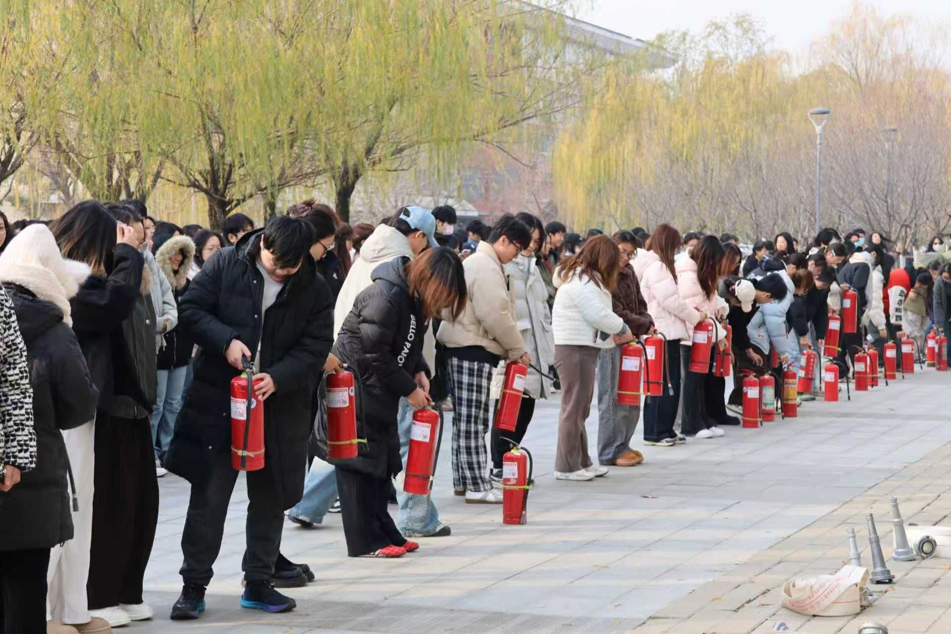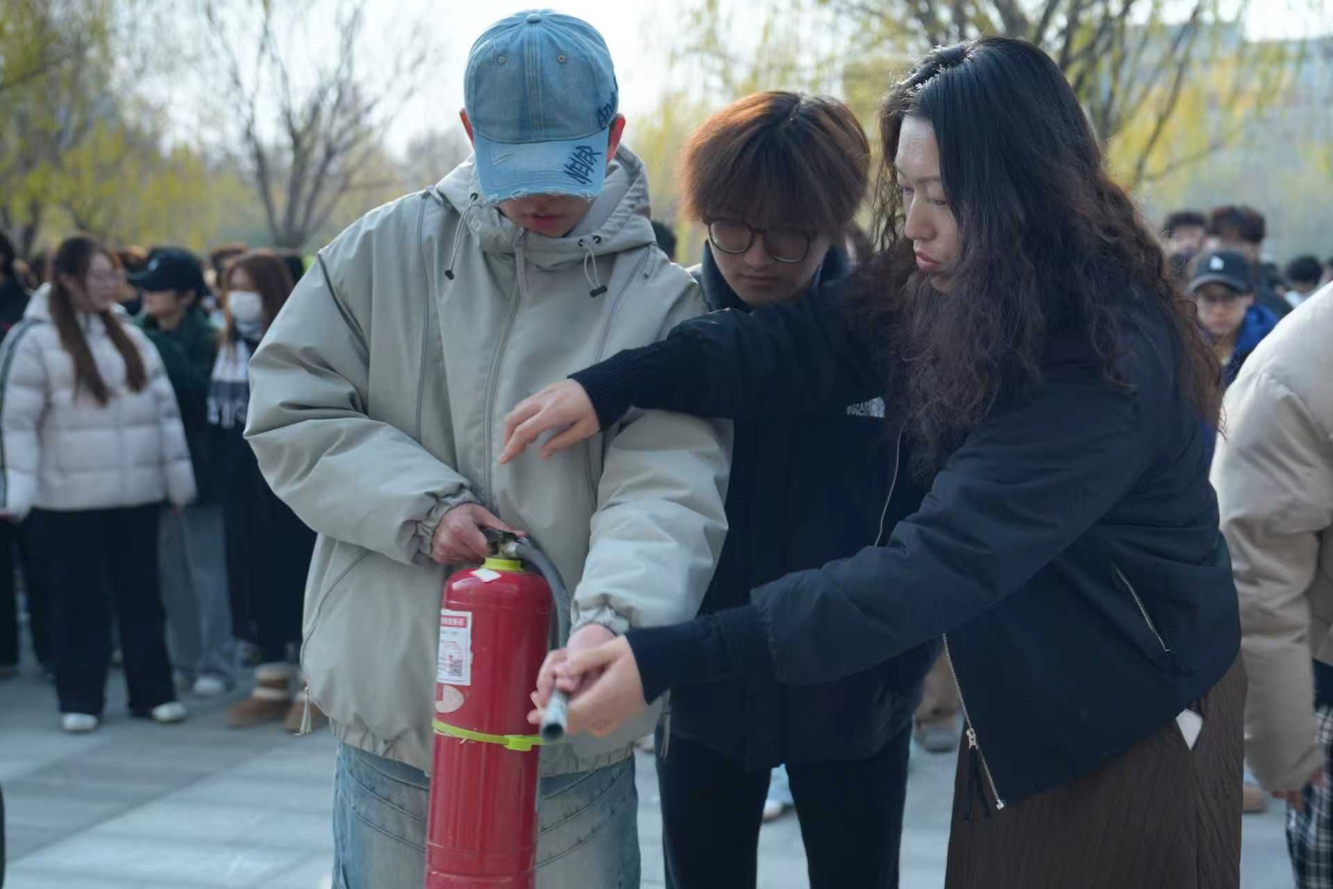 随后,孙志华讲解并演示常用器材灭火器、消防水带的操作规范。讲解结束后,师生们有序参与实操体验,在消防科老师的专业指导下规范操作灭火器、衔接铺设消防水带,亲身践行操作要领,师生全程参与,态度认真,实操效果显著。