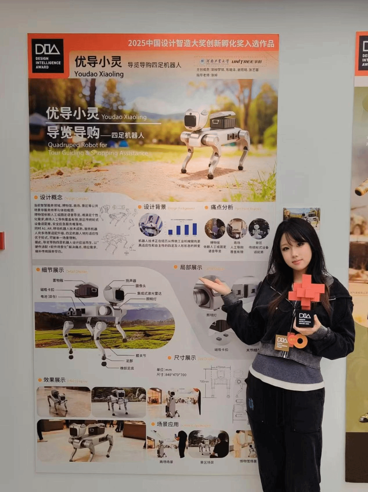 设计艺术学院副院长王冬出席颁奖典礼,并代表领取“DIA最佳组织奖”。设计艺术学院产品设计与工业设计专业负责人张婷老师指导,郭柳梦锦、陈曦泽、等同学设计的“优导小灵——导览导购四足机器人”、周晓彤、杨孟磊同学设计的“yoosea便携式智能洗浴机”,陈柄言老师指导,权丽薇、王怡情设计的“设计赋能——文旅机器人”、王嘉铭、王玲设计的“仿生机械·景区山路智能运输员”等六件作品荣获“DIA创新孵化佳作奖”。