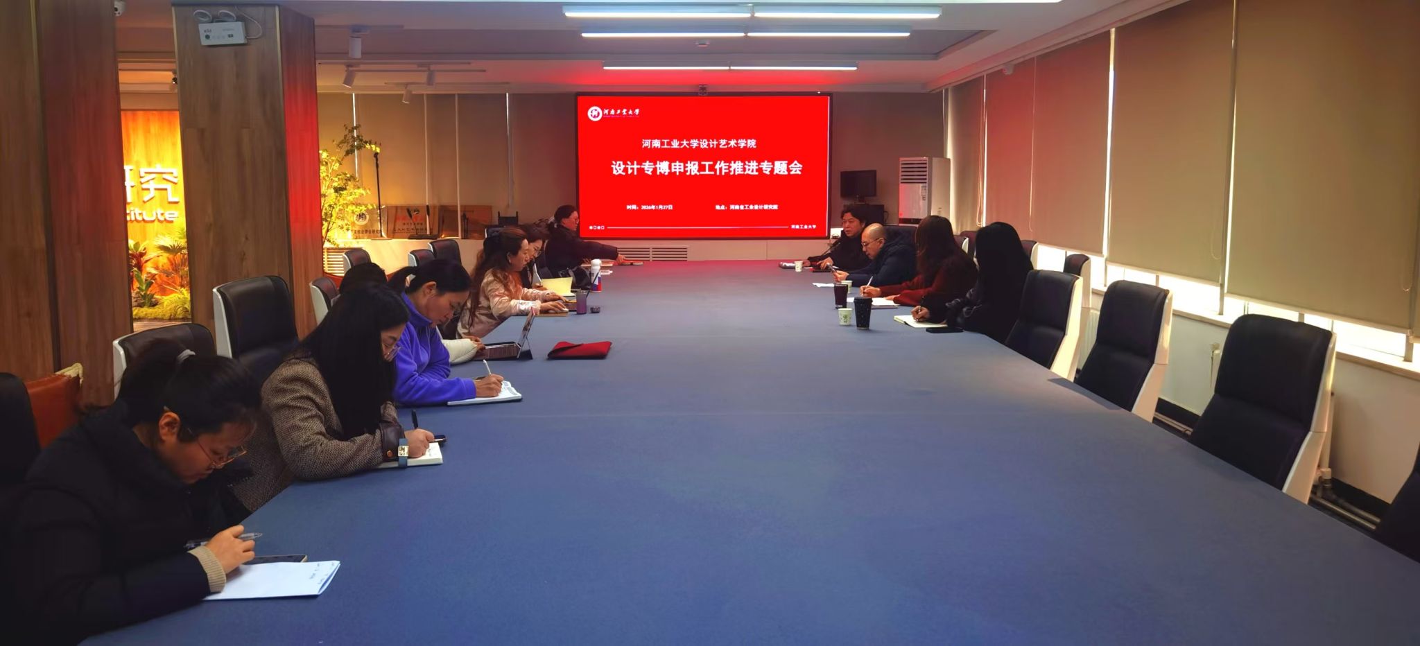 为加快推进设计学专业博士学位点申报工作,统一思想、凝聚共识、明确任务,2026年1月28日上午,设计艺术学院在18号楼三楼河南省工业设计研究院召开专业博士学位点申报工作推进会。学院党委书记段慧子、党委副书记朱玲玲、副院长魏强、副院长王冬、副院长訾鹏,以及专博申报工作小组相关行政人员与骨干教师参加会议。会议由副院长魏强主持。