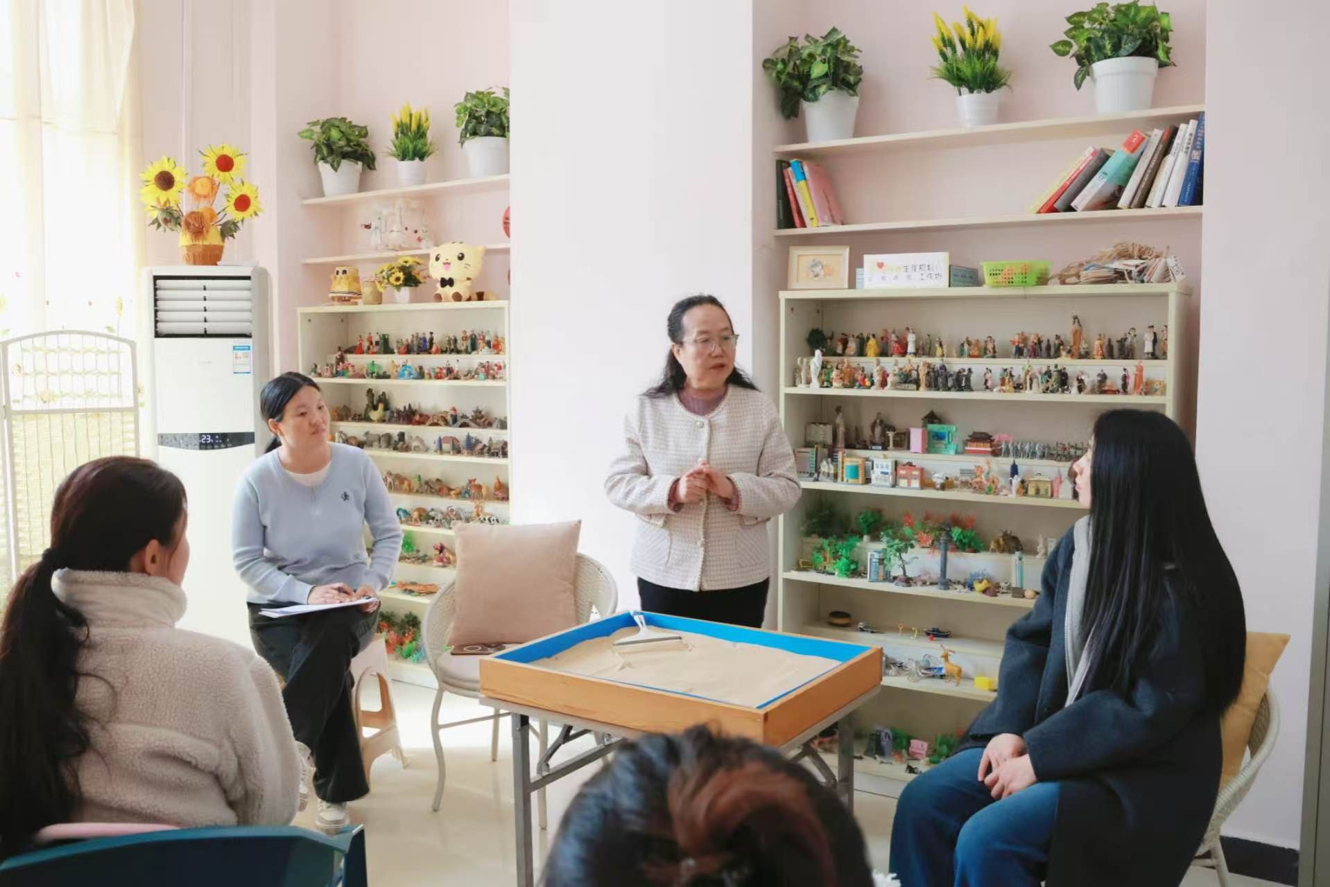活动伊始,尚老师以沙盘心理学为切入点,向在场教职工科普沙盘的奥秘:“在方寸沙盘之间,每一粒沙、每一个摆件都是内心情绪的投射,能让未说出口的心事有处安放,让隐秘的情感自然流淌。”接着,活动进入体验环节,教职工们围坐沙盘旁,在尚老师的温柔引导下,依次挑选沙具、摆放场景,共同构筑专属的沙盘世界。从小心翼翼的试探到默契十足的协作,大家在触摸细沙、摆放摆件、为沙盘取名的过程中,逐步打开心扉,将日常的压力与疲惫转化为具象的沙盘语言。